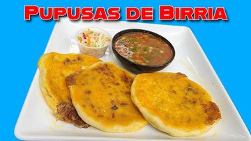 A Salvadoran-style pupusa stuffed with tender birria beef and melted cheese, served with curtido and consome.