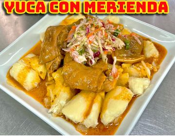 Traditional Salvadoran dish with tender cassava (yuca) topped with a broth, pork feet, heart, ear, skin, and liver. Accompanied by curtido (pickled cabbage slaw) and tomato sauce.